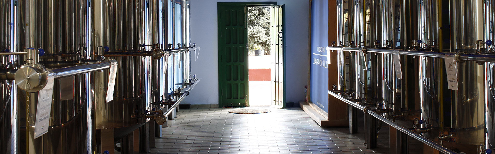Almacenamiento. Una vez extraído el zumo de las olivas, se vierte en los decantadores de acero inoxidable y se almacena en grandes depósitos de este mismo material en la bodega.