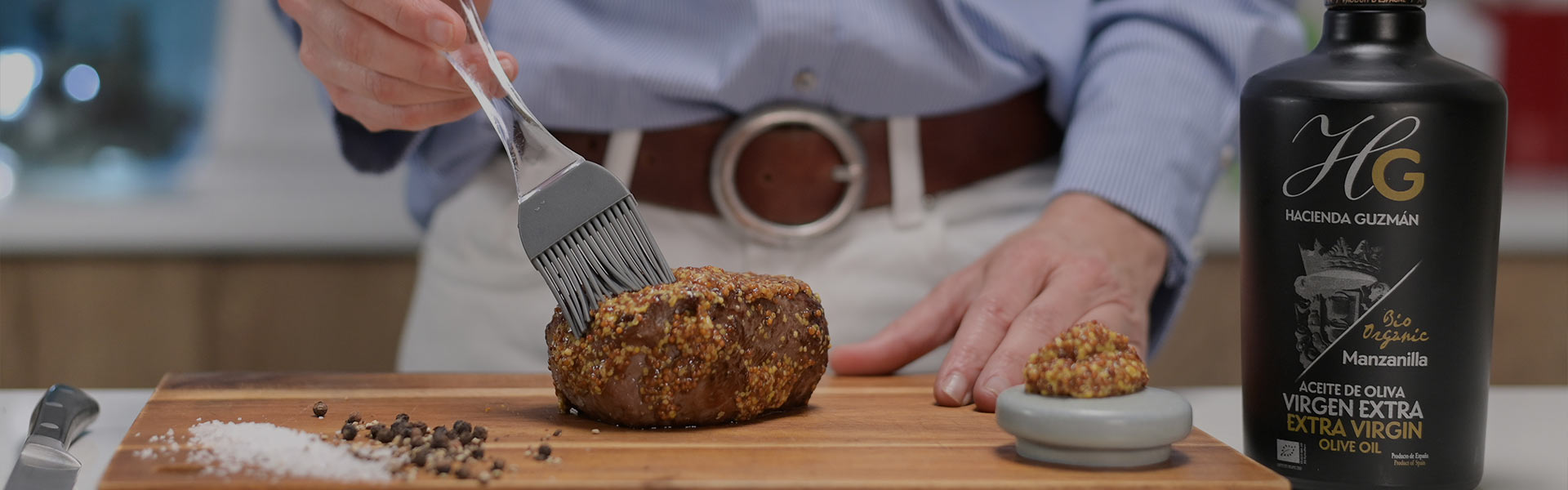 1. El primer paso es poner a calentar una sartén con el fuego a tope y añadir unas gotas de Aceite de Oliva Virgen Extra Manzanilla Hacienda Guzmán. Cuando empiece a humear, doramos nuestra pieza de carne de ternera por todos lados.