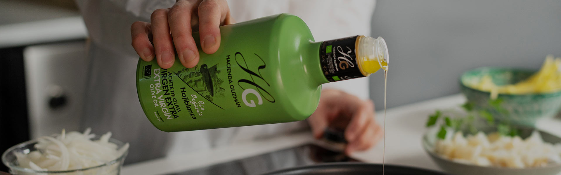 - Picar la cebolla muy finamente en juliana. A continuación, verter el AOVE Hacienda de Guzmán Reserva Familiar Hojiblanca en una sartén amplia y pochar.