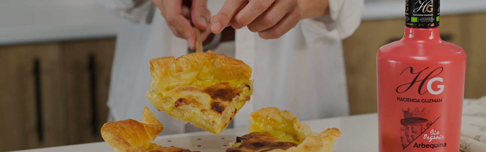 Prepara esta receta de tarta de pera y hojaldre empleando ingredientes de calidad como nuestro Aceite de Oliva Virgen Extra Arbequina Hacienda Guzmán. ¡Muy fácil y rápido!