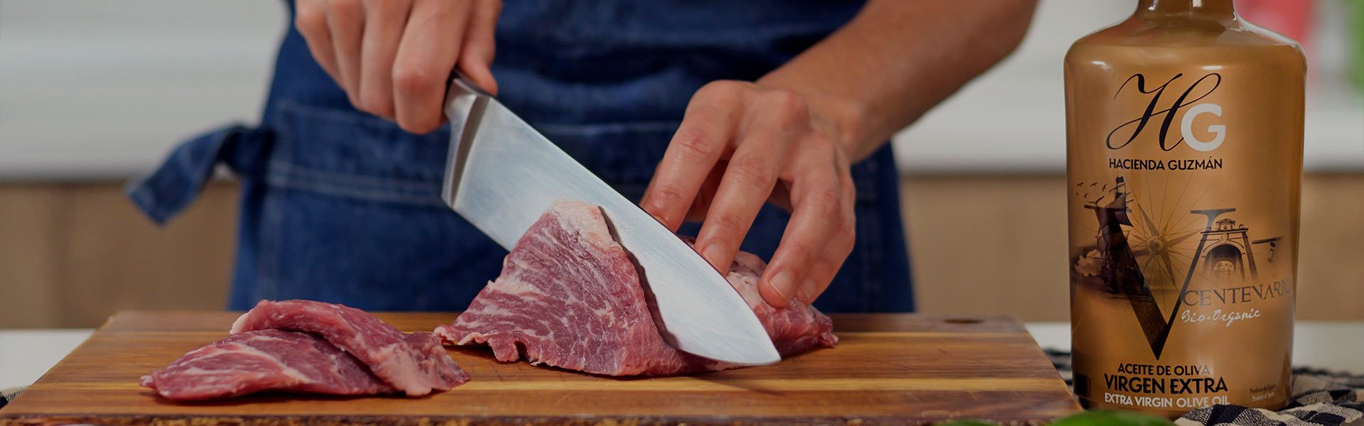 2. Smear the pieces of Iberian pork loin with V Centenario Hacienda de Guzmán Extra Virgin Olive Oil.