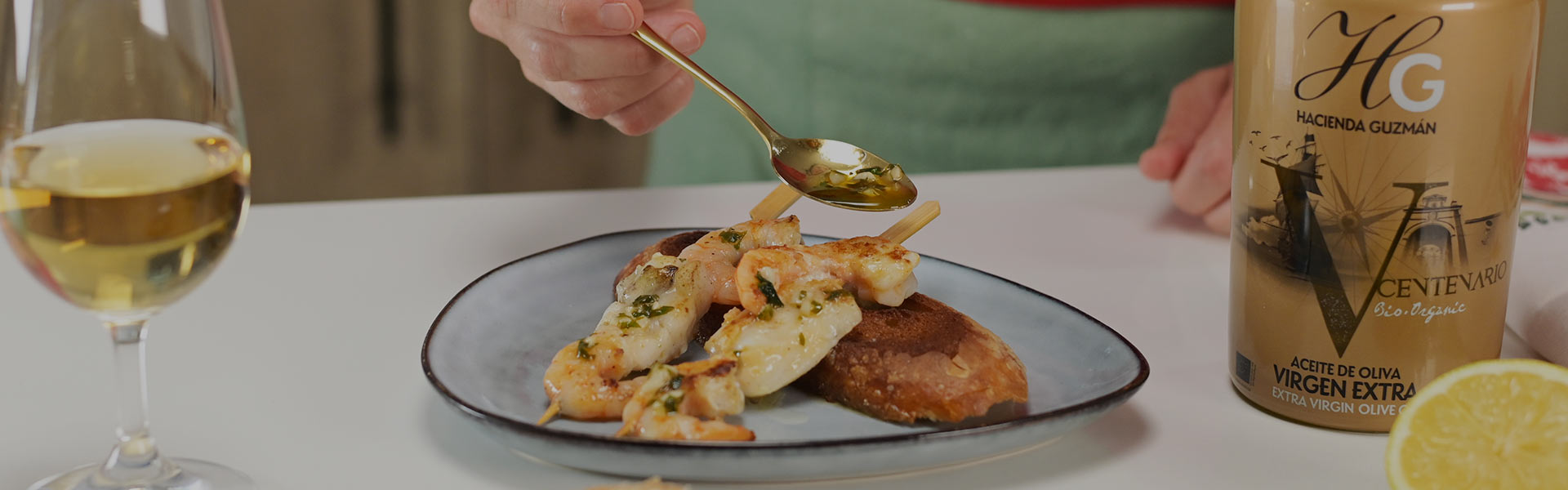 This Christmas, enjoy your special meals with this monkfish and prawn skewer recipe paired with our distinguished Extra Virgin Olive Oil Hacienda Guzmán V Centenario. A dish that goes beyond the traditional, fusing the freshness of monkfish and the delicacy of prawns.