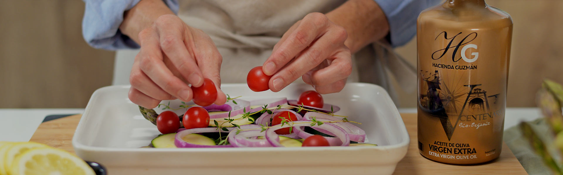This baked sea bass with vegetables with V Centenario Hacienda de Guzmán Extra Virgin Olive Oil is an easy recipe to make and very healthy. Baked dishes, in addition to being healthier, allow you to enjoy a more authentic flavour, since the ingredients are cooked in their own juices.