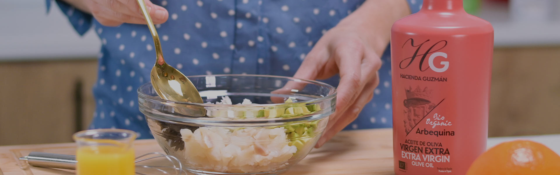 3. To make the vinaigrette, place the salt, pepper, mustard and orange juice in a bowl. Mix everything well and add the Arbequina Hacienda Guzmán Extra Virgin Olive Oil, beating well to emulsify.
