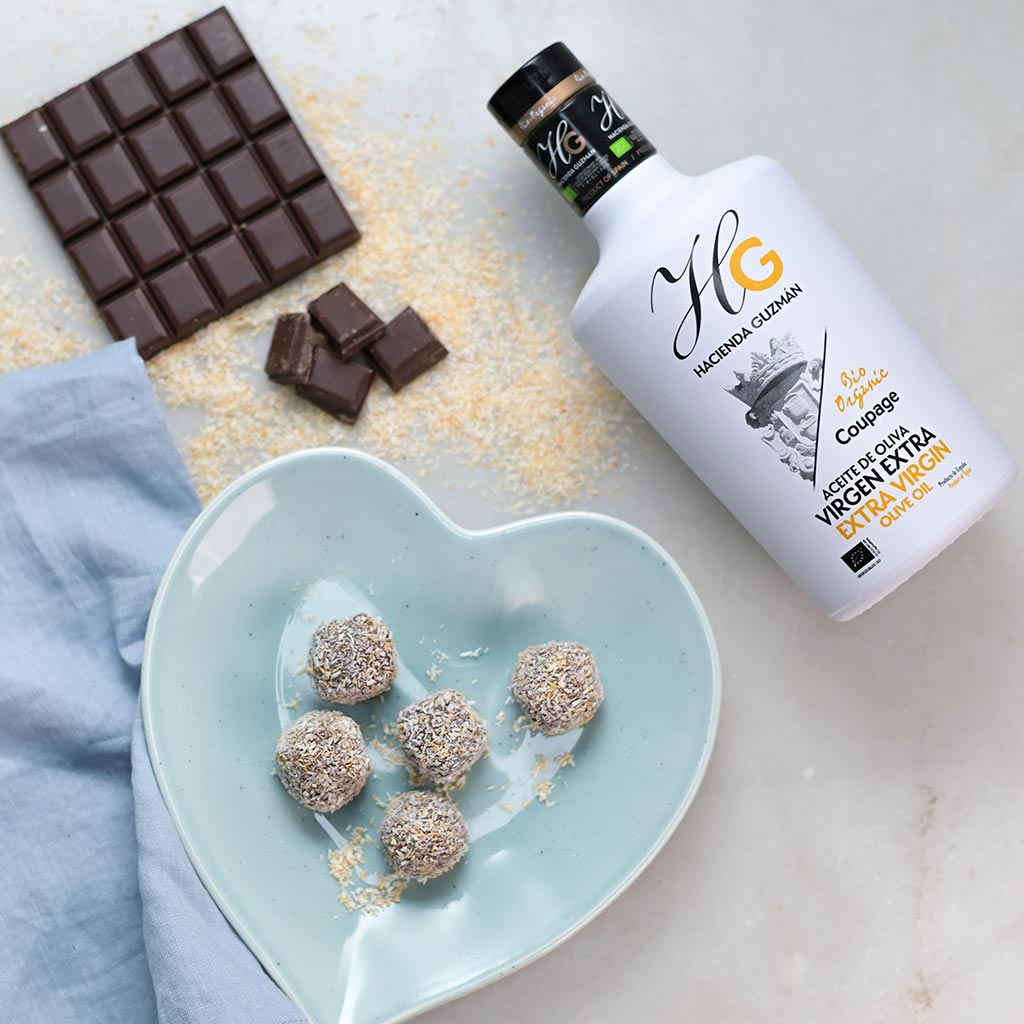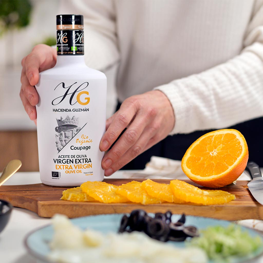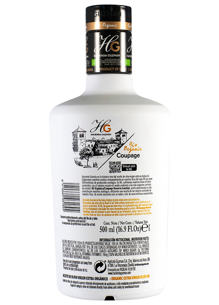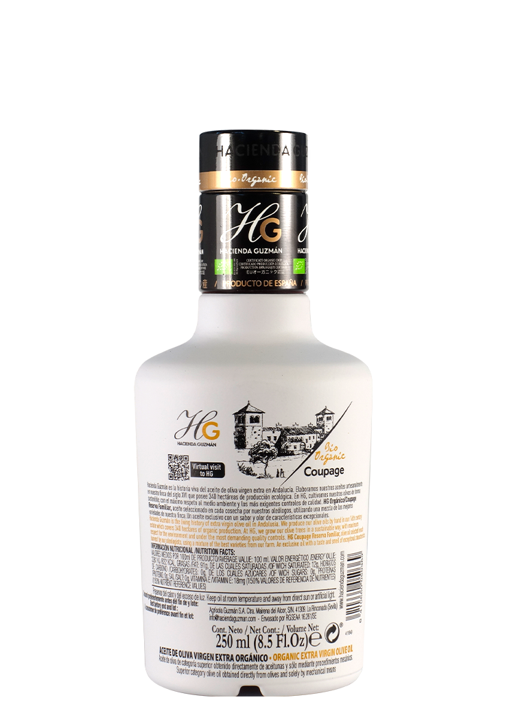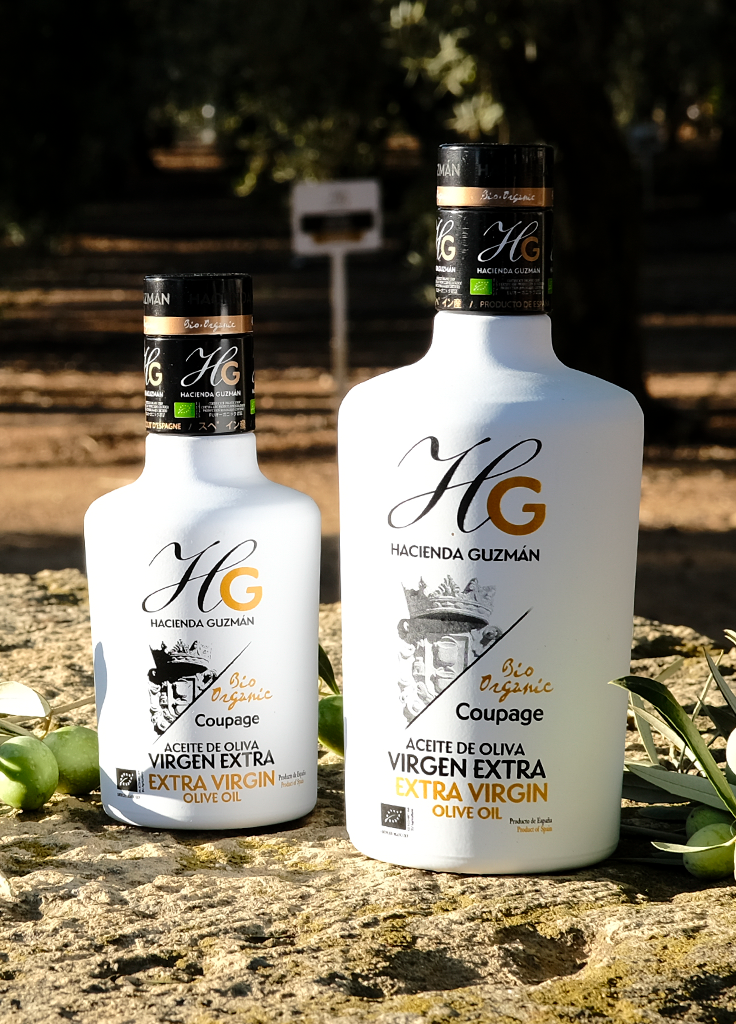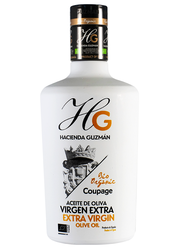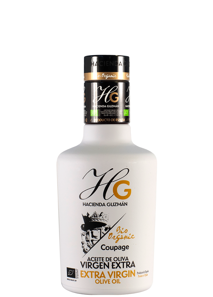 Extra Virgin Olive Oil HG Coupage from Hacienda Guzmán. Organic full-bodied olive oil, greenish in colour. Certified organic production. HG Coupage is obtained from the combination of the best flavours from Hacienda Guzmán. A 100% organic coupage olive oil with a distinguished fragrance and a genuine sensation on the palate: with the aroma and freshness of Hojiblanca, the fruitiness of Arbequina and the exclusivity of Manzanilla. This extra virgin olive oil is presented in an elegant case, perfect as a gift for friends, family or business.