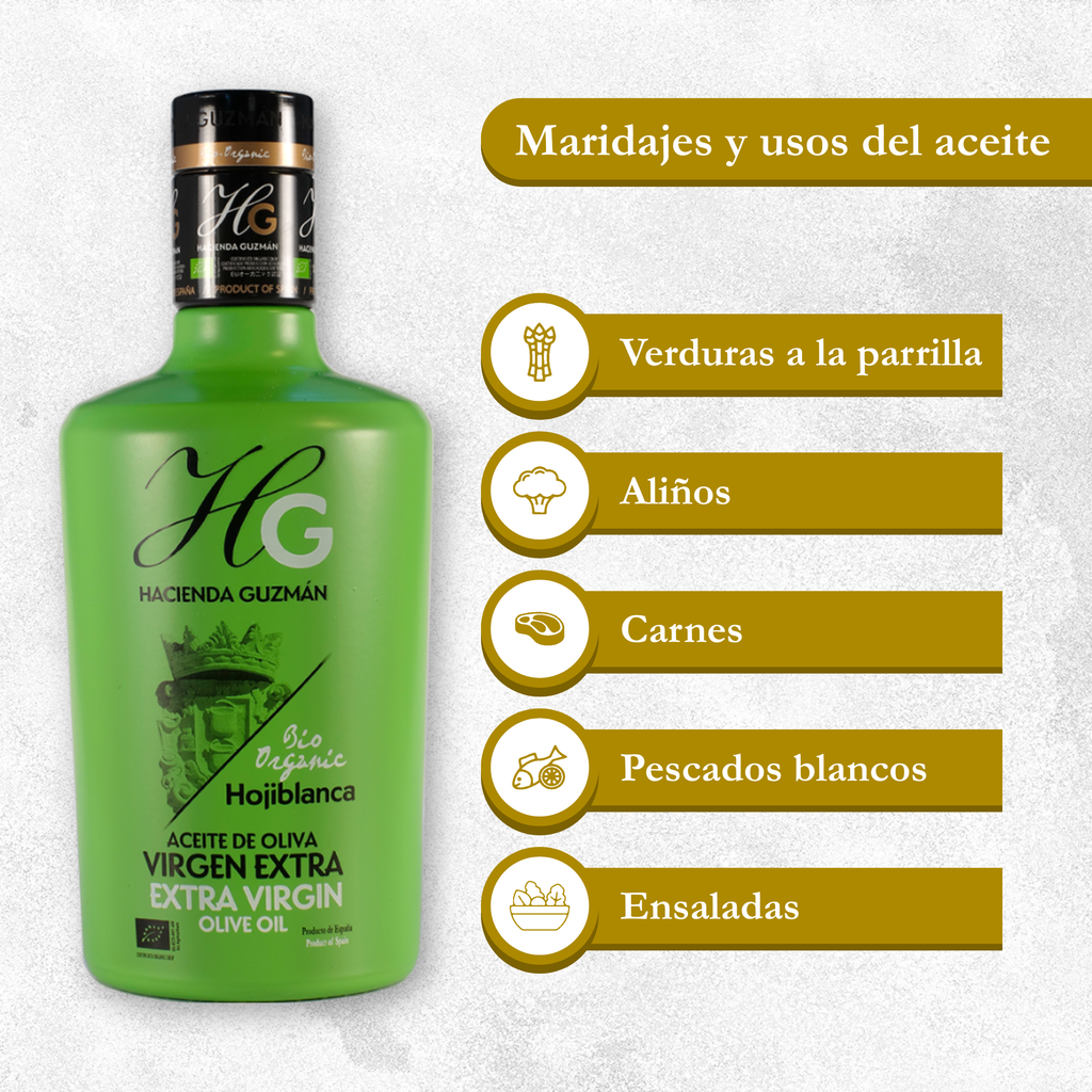 La variedad hojiblanca recibe su nombre por el envés blanco de su hoja. También es conocida en Andalucía con el nombre de Lucentina y representa la tradición olivarera de la Hacienda Guzmán. Además, cuenta con el sello ecológico de garantía de la Unión Europea, un certificado de calidad que garantiza que está libre de residuos perjudiciales persistentes que pudieran proceder de pesticidas o fertilizantes sintéticos.