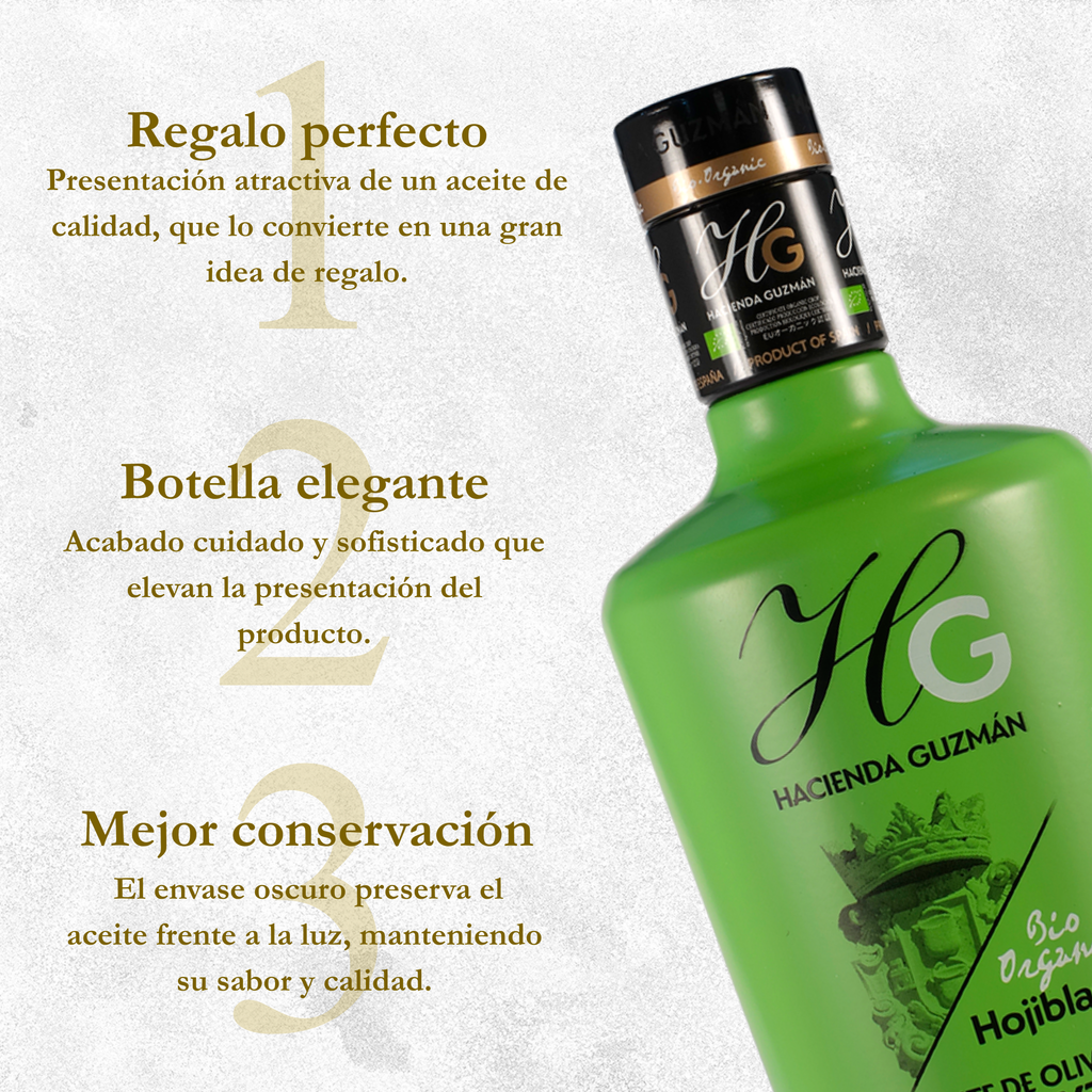 Dale el toque final a tus platos con el aceite de oliva virgen extra hojiblanca, un mono varietal 100% ecológico que ha sido recolectado en verde en la Hacienda Guzmán. Aceite de oliva virgen extra en el que se antepone la calidad al rendimiento de la aceituna (12 %).