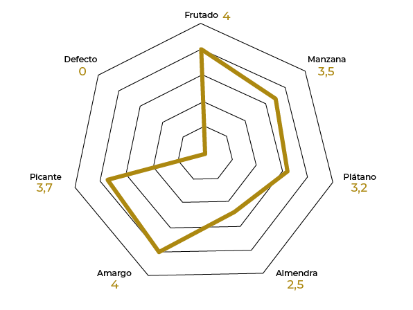 “Aceite con cuerpo, color verdoso y extraordinaria fragancia. Olor a aceituna verde muy frutada identificable en nariz con aromas herbáceos. En boca con sabor a verde hoja, equilibrado en el amargo y el picante, ligero sabor a almendra y a madera fresca, que le proporciona una personalidad muy definida”
